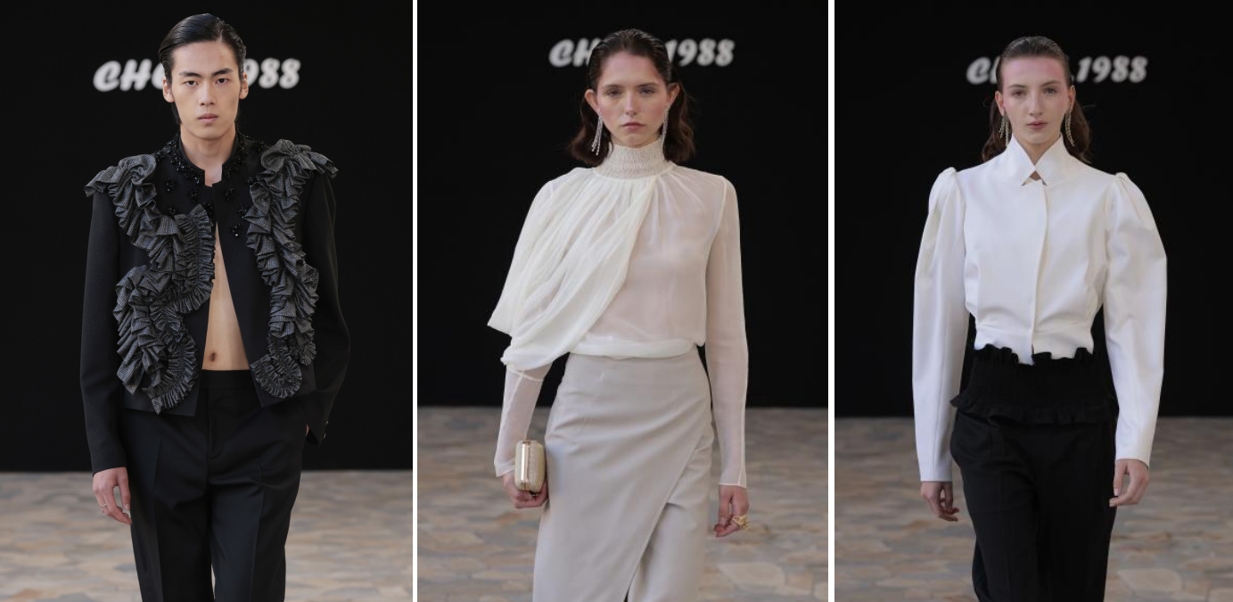 鐘楼の鐘の音が暗い屋根の上を響き渡る中、最近「ゴールデンクラウン賞」を受賞した陳龍による「秋の理想」ショーケースがロマンティックに幕を開けた。廊下の床タイルは夕暮れと舞台照明を反射し、モデルのスカートのピンクのグラデーションと絡み合っていた。手作業でビーズをあしらったリボンは、歩くたびに優しく揺れ、レースとレーザーカットのディテールで作られた立体的なテクスチャーが柱の間を光と影で彩っていた。肩のデザインのシャープなシルエットは、遠くに見える時計塔のクラシックなラインを彷彿とさせた。陳龍は「秋」を詩に用い、単なる表現を超え、柔らかなピンクとチャコールグレーの衝突、繊細な紗とシャープなカットアウトの相互作用を用いて、歩くリズムを通して女性の穏やかでありながら豊かな内面世界を描き出しました。シースルーのネックラインのギャザーディテールは伝統的なエレガンスの境界を打ち破り、パフスカートは現代的なシルエットと融合し、歩くたびにリラックスして自信に満ちた東洋の美的態度を伝え、気楽さと鮮やかなデザインの緊張感の両方を醸し出し、現代中国デザインならではの魅力を披露しました。