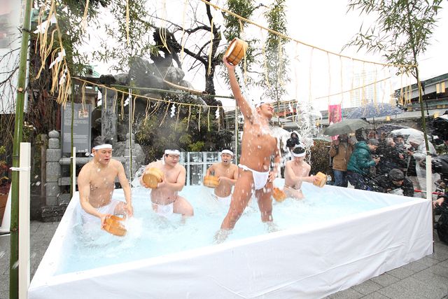 厳しい寒さのなかで寒中禊に臨む参加者たち