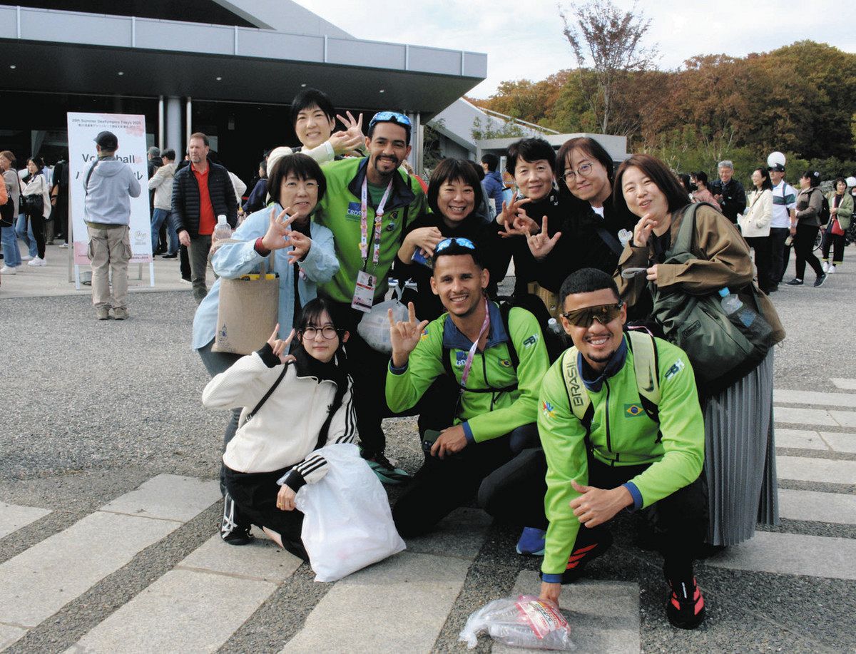にぎわう競技会場前で、たまたま出会った海外選手と手話や身振りで交流した観客たち=11月、世田谷区の駒沢オリンピック公園で
