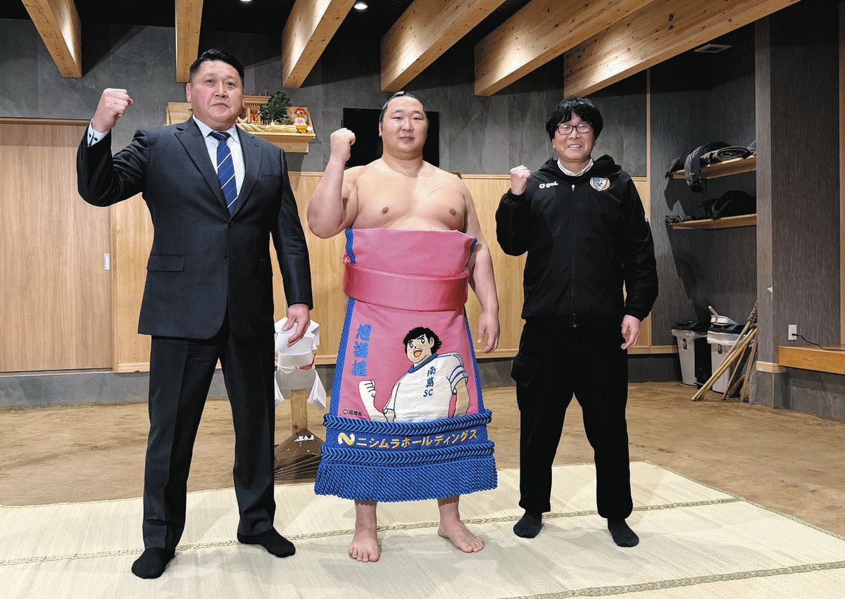 化粧まわしはピンクの地にガッツポーズする翼くんの絵をあしらっている。大島部屋で7日に初披露された。まわしを締めた旭海雄関が登場すると、元関脇旭天鵬の大島親方は「ピンクが意外...