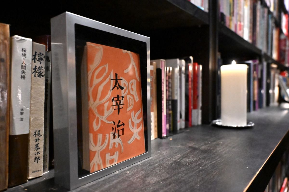 店内に展示された太宰治の「人間失格」の初版本(田中健撮影)