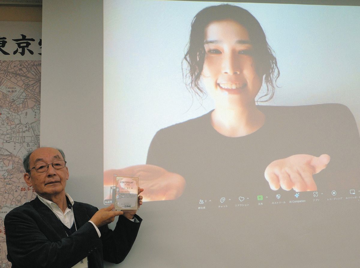 継承者育成プログラムの修了証を画面越しに受け取るしぐさをする丸谷裕子さん。左は東京大空襲・戦災資料センターの吉田裕館長=東京都江東区の東京大空襲・戦災資料センターで(坂本亜由理撮影)