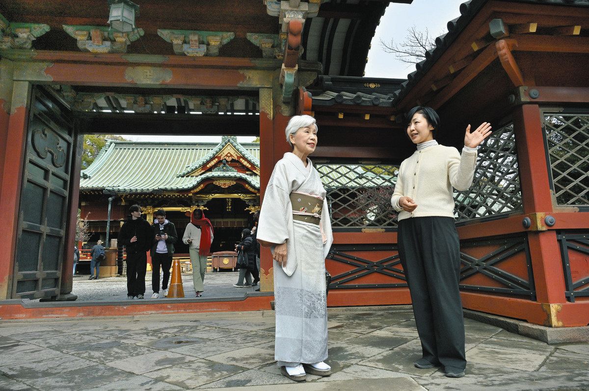 根津神社の唐門前で内海明子さん(右)から境内の説明を受ける田中優子さん=いずれも文京区で