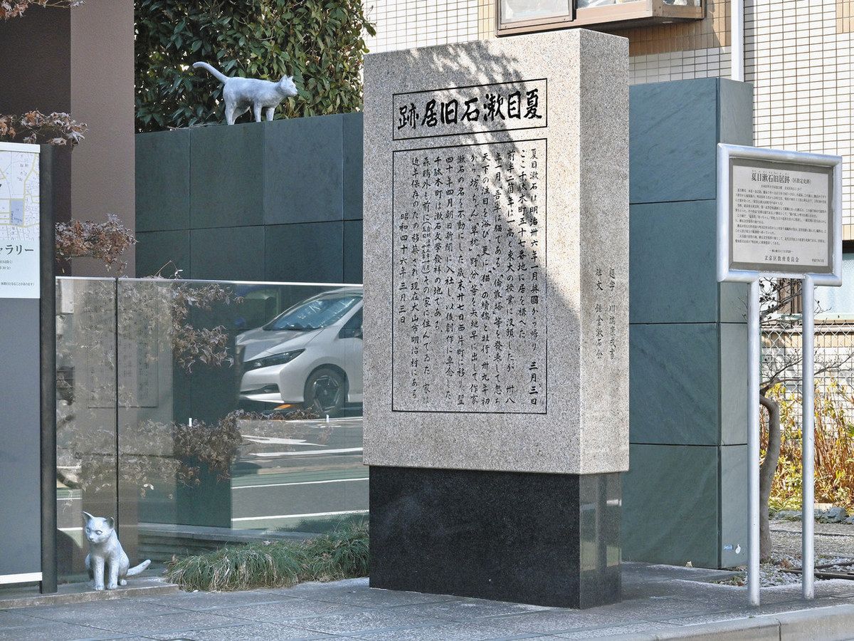 夏目漱石の旧居跡に建てられた石碑と猫の像