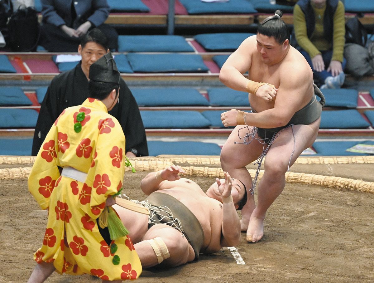 【初の三段目だった昨年11月の九州場所はけがで途中休場。悔しさを味わったが、再び力を蓄え三段目に戻ってきた。春場所12日目、6番相撲で勝ち越しを決め、幕下昇進を確実に。取組後は晴れやかな表情を浮かべた】