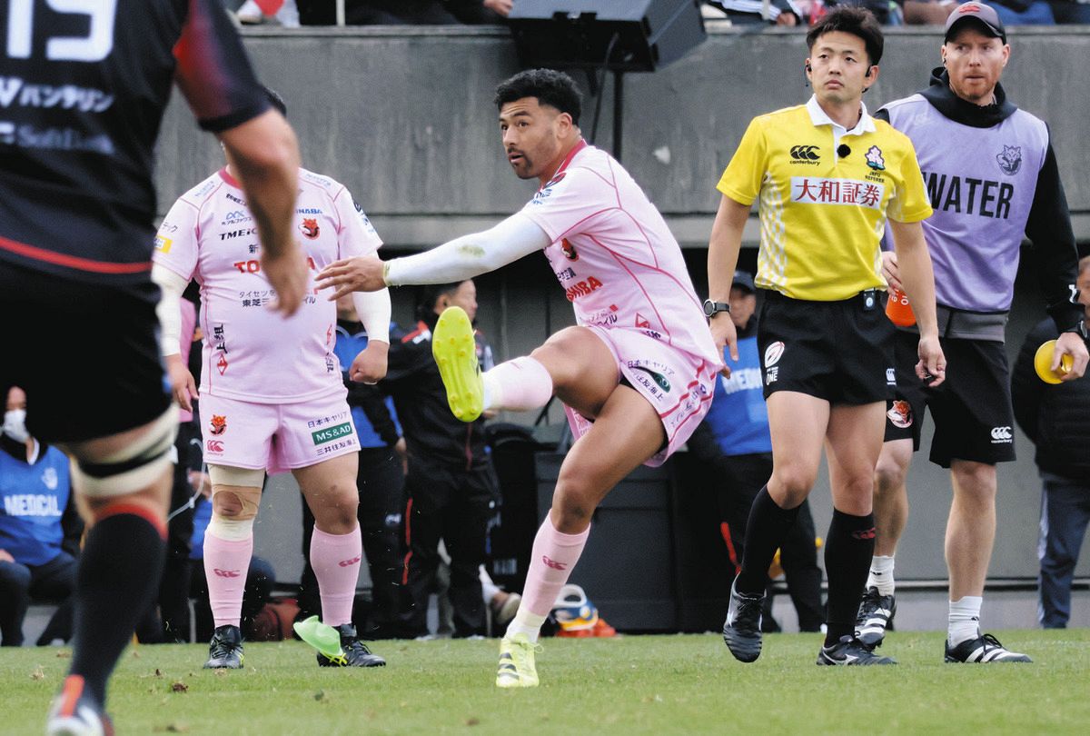 BL東京ー三重後半37分、一時勝ち越しとなるPGを成功させるBL東京のモウンガ=東京・秩父宮ラグビー場で(武藤康弘撮影)