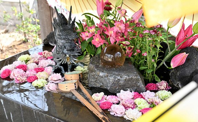 水に浮かぶ華やかな花が美しい法輪寺(新宿区)の花手水。コロナ禍の時、ひしゃくを持つのを...
