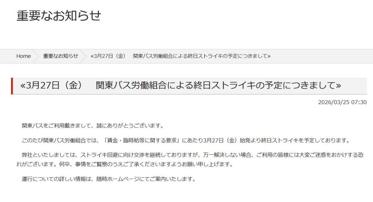 ストライキの恐れがあるとする関東バスのホームページ(スクリーンショット)