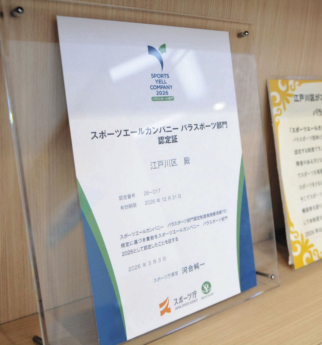 スポーツ庁から授与された認定証=江戸川区役所で