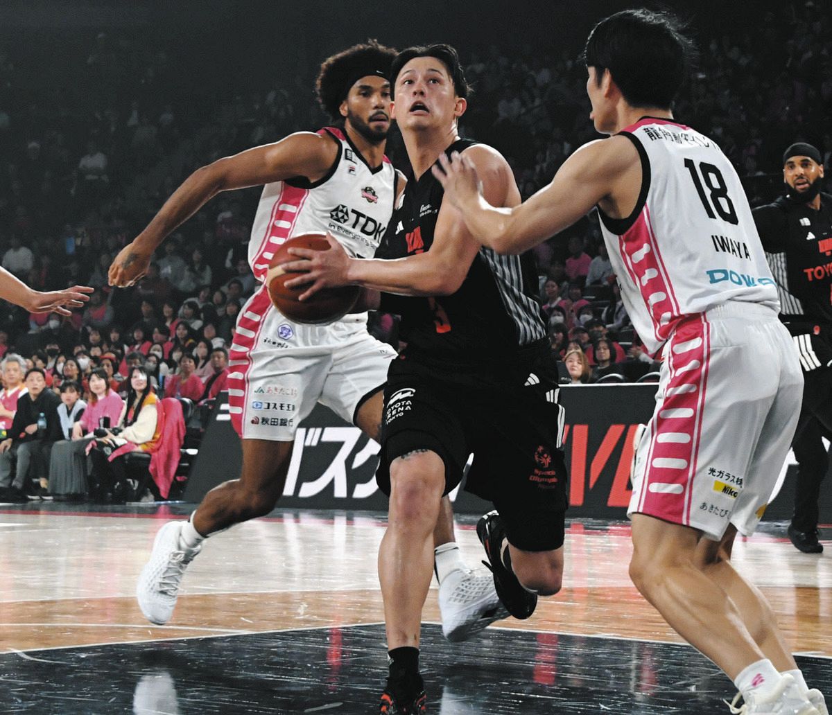 A東京ー秋田ドライブでゴール下に侵入するA東京のテーブス(中)=4日、トヨタアリーナ東京で(渡邉陽太郎撮影)ここ数試合続いたコミュニケーション・ミスも改善に向かった。連敗中は相手の連係攻撃に対し、どちらか1人のマークが甘くなって失点を重ねた。今節はマークの入れ替えミスを最少にし、振り切られても別の選手がすぐに助けた。最大20点差を逆転された前節の映像を見ながら、問題点を徹底的に話し合った成果が出た。