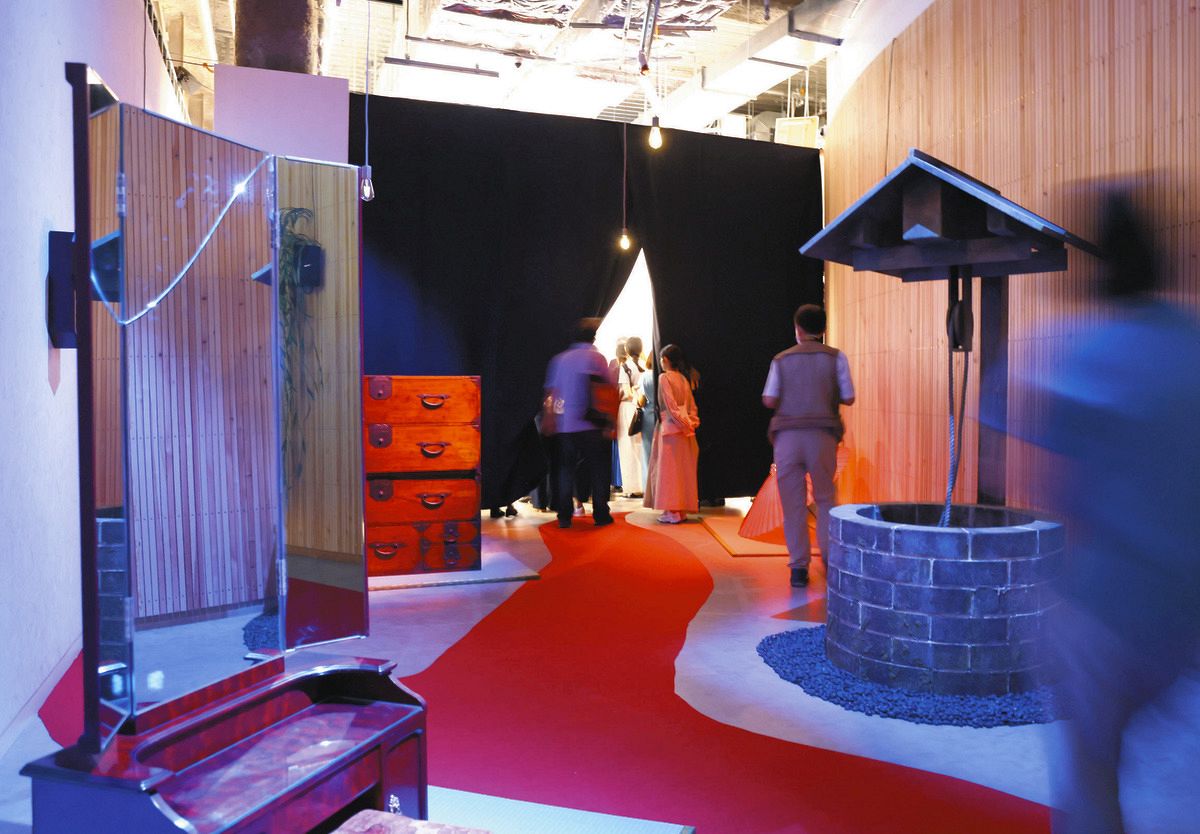 「オバケ?」展の会場に入って戸惑った。ここは美術館だよな?目の前に広がるのは、おばけ屋敷。ヒュ~というおなじみの効果音が響くなか、たんすなどが置かれた暗い小道を歩く。化粧台の鏡には自分だけでなく正体の知れない何かが映り込みそうで、さっと通り過ぎた。