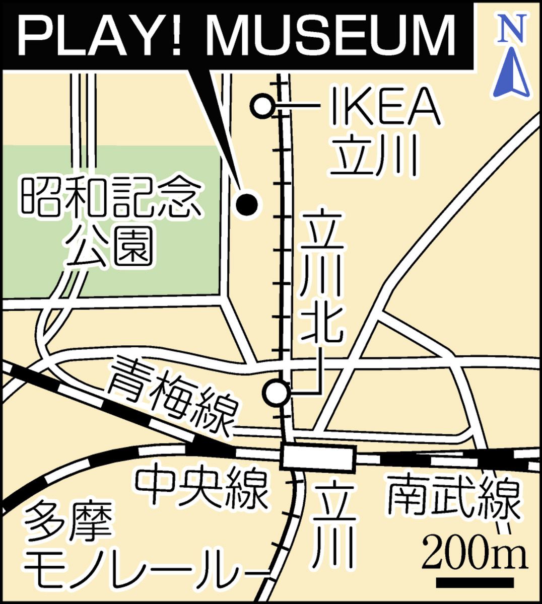 PLAY!MUSEUM立川市緑町3-1 GREEN SPRINGS W3棟2階。JR立川駅、多摩モノレール立川北駅から徒歩10分。開館時間は午前10時~午後6時。会期中無休。一般1800円、大学生1200円、高校生1000円、中学生600円、小学生以下無料。立川市在住・在学者の割引あり。問い合わせは電042(518)9625へ。