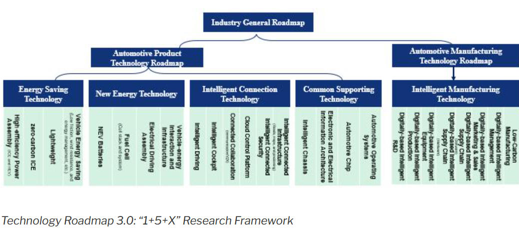 テクノロジーロードマップ3.0は、「将来を見据えたビジョン、体系的な連携、科学的厳密さ、進化の継続性、オープンなコラボレーション、そして公共の利益志向」という改訂原則を強化しています。テクノロジーロードマップ2.0の基礎となる「1+X」研究フレームワークを基盤として、最新の産業変革と新たなエコシステムのダイナミクスに合わせた「1+5+X」フレームワークを導入しています。このフレームワークは、「産業製品イノベーション」と「スマート自動車製造」の技術ロードマップを構造的に統合しています。