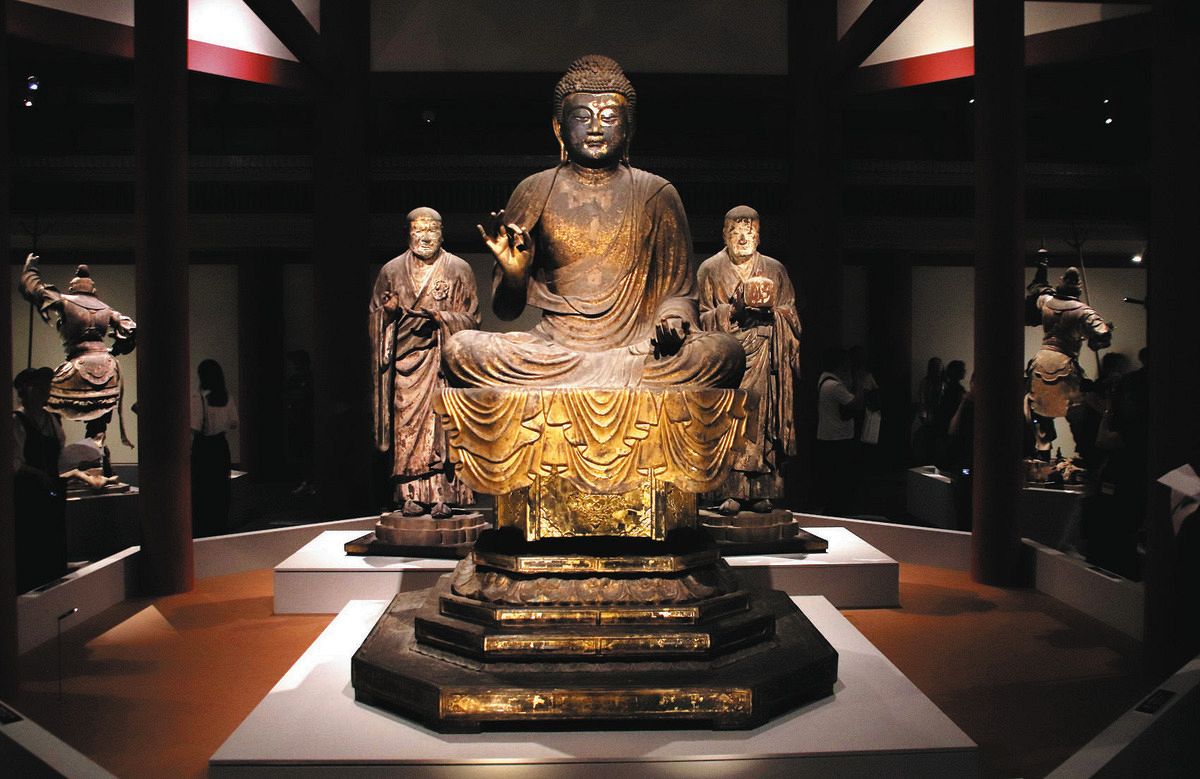 今回、一つの展示室に7体が一堂に会した様子は圧巻。傑作として名高い弥勒如来坐像は約60年ぶりの寺外公開で、厳しいまなざしや張りのある頰、堂々とした体に、奈良時代の古典彫刻を学んだ成果が表れている。