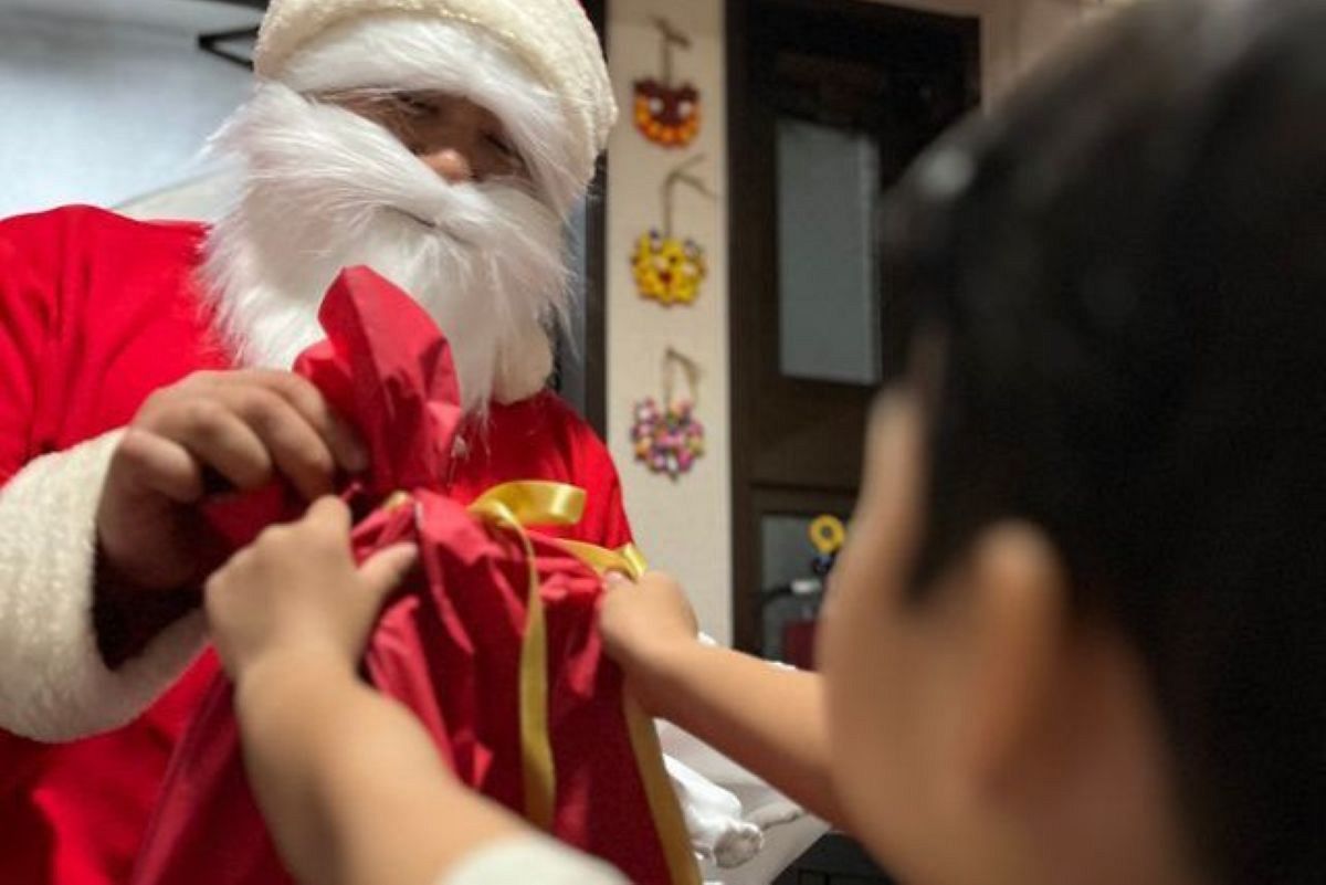 サンタにふんしたボランティアから本のプレゼントを受け取る子ども(清輔夏輝さん提供)