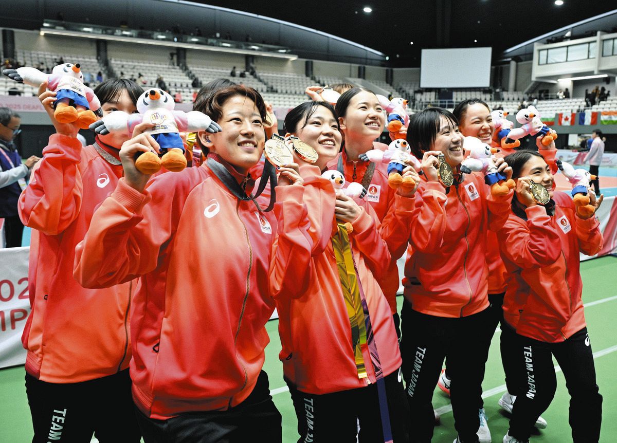 金メダルを手にスタンドの方向を向く中田美緒(手前左)ら=25日、駒沢体育館で(木戸佑撮影)