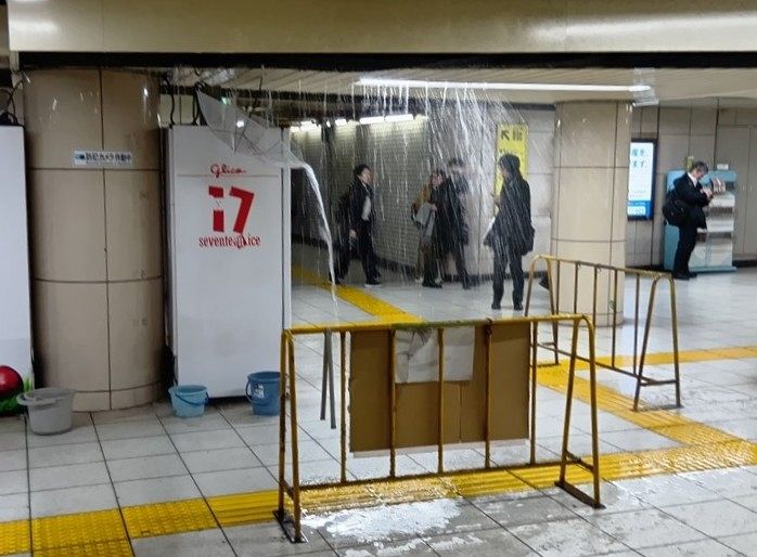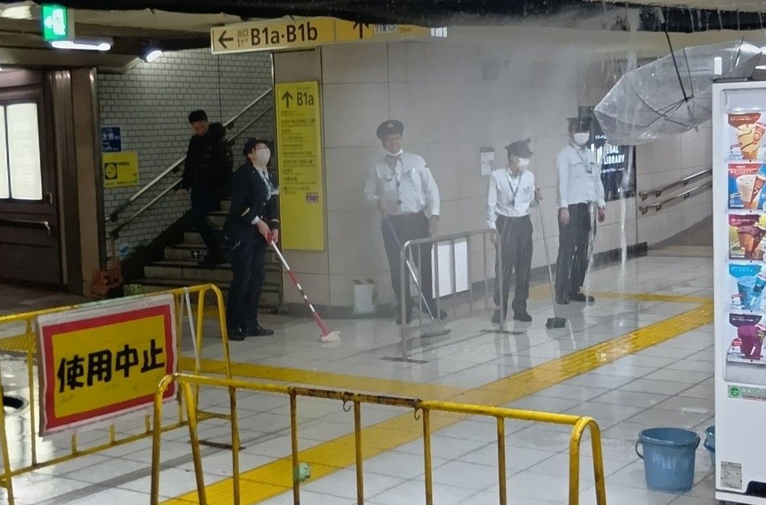 構内には一時、3センチほどの水たまりが数メートルに広がっていた。厚生労働省や弁護士会館につながる改札で、天井から勢いよく水が噴き出し、複数の駅員がモップを手に対応に当たった。駅員は「(水たまりが)深いので気を付けてください」と声をかけていた。(戎野文菜)