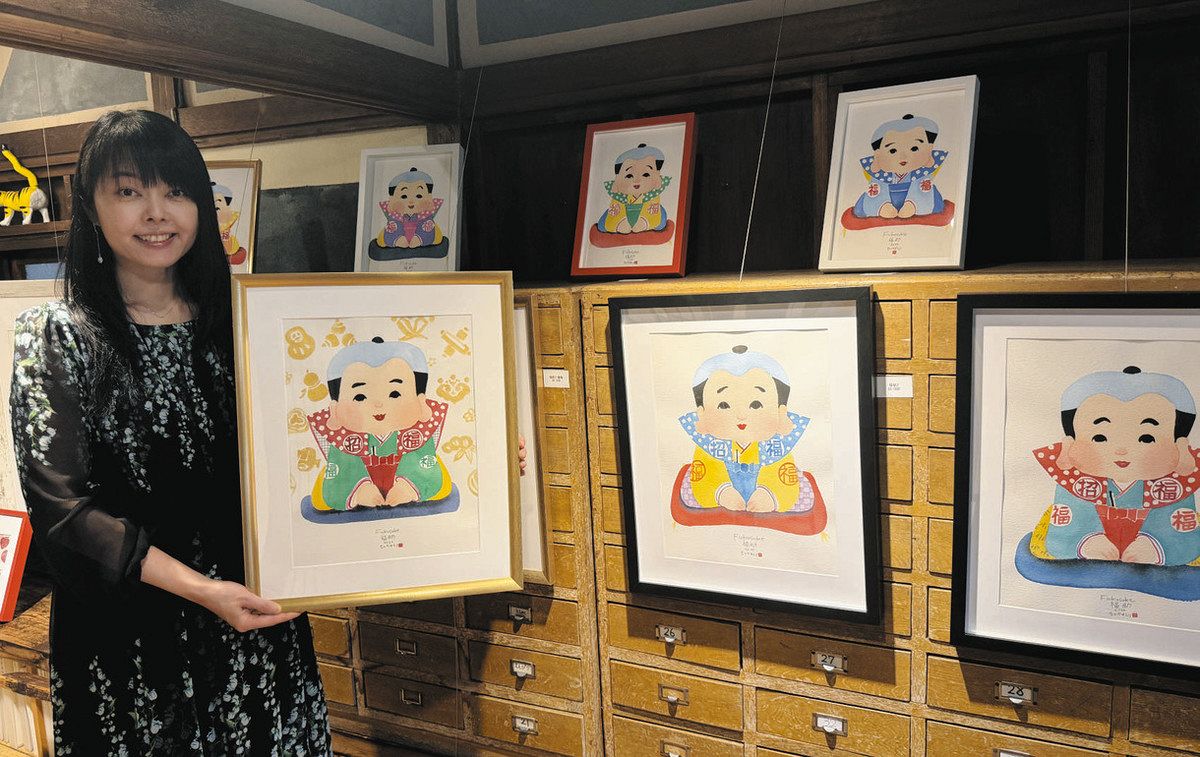 福助人形を描いた作品を手にするなかだえりさん=足立区で
