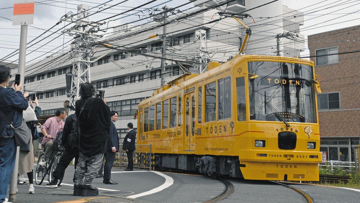 車両お披露目式を終え出発したリニューアル車両=いずれも荒川区で